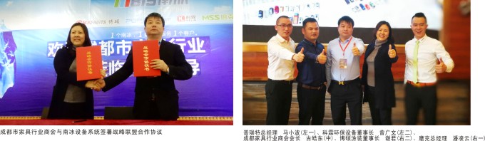 参观结束后,磨克总经理潘凌云、博硕涂装董事长谢君、科霖环保设备董事长曾广文、普瑞特总经理马小波与考察团一起进行了交流座谈。考察团成员就“南冰”系统的服务和作用,详细的进行了咨询和了解。交流座谈会上,成都市家具行业商会与南冰设备系统签署战略联盟合作协议。