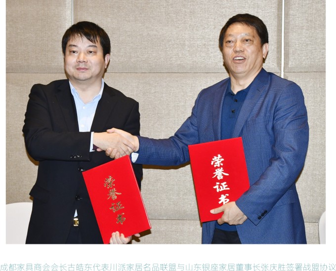 会上,成都市家具商会会长古皓东为大家介绍了川派家居名品联盟的组建和目标。他谈到,成都家具行业产生了像明珠、全友、双虎为代表的巨头企业,同时,也产生了像沃克、得一、帝标这样定位于一二级市场的品牌企业,但与京派、浙派、粤派家具企业相比仍有一定差距。商会成立川派家居名品联盟,旨在帮助川派家居品牌企业改变过去“单打独斗,各自为阵”的竞争现状,打造团结、合作、发展、共赢的平台,实现“共聚、共创、共享、共赢”的联盟目标。同时,提升川派名品家居的品牌建设,推动川派名品家居的渠道建设,加强与全国知名家居卖场的密切合作。银座家居是山东最有影响力,最有知名度的企业,带来了国有企业的生产经验,在山东建材家居行业中处于领先地位,希望川派家居名品联盟能与山东银座家居强强联手,加强沟通和交流,携手合作,共赢市场。