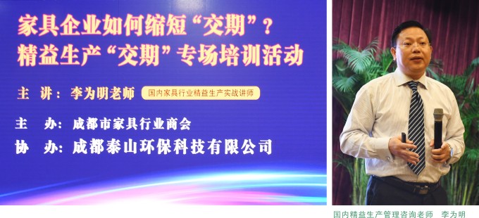 11月14日下午,由成都市家具行业商会主办,成都泰山环保科技有限公司协办的成都家具工厂精益生产“交期”专场培训活动,在成都市双流蛟龙港川投酒店举行。商会邀请国内精益生产管理咨询老师李为明就家具企业如何“排程”、如何科学合理安排生产计划等精益化管理问题为大家做了精彩分享。200余位成都家具行业同仁参加了此次培训活动。