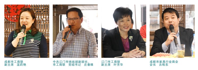 中共广东省江门市统战部副部长、江门市工商联党组书记庄春维发表讲话。首先他对成都市工商联和成都市家具行业商会的热情接待表示真诚的感谢,他还就江门市的企业情况以及6大支柱产业情况进行了简单介绍。他表示,此次成都之行是带着谦卑的态度来学习,来取经的,希望通过此次交流能够加深彼此了解,增进彼此感情,把好的企业管理经验和先进的生产理念带回江门。