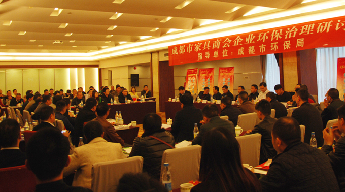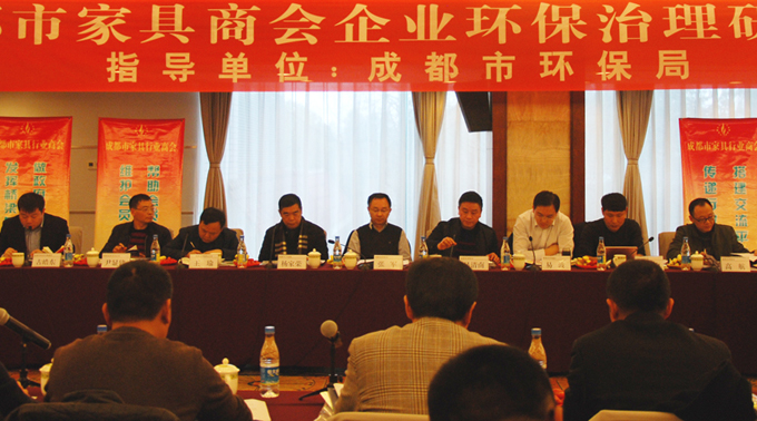 2017年3月9日下午,成都市家具商会企业环保治理研讨会在金牛宾馆隆重召开。成都市环保局副局长张军、工业污染监督管理处处长吴清南、环评处处长易波、大气环境处副处长代仕均、环境执法支队副支队长高航到会讲解环保法规。成都天子集团董事长杨家荣、明珠家具副总裁王瑜、双虎实业董事长尹显建、皇玛•梦丽莎总经理叶晓亮等200余位行业同仁参会。会议由商会秘书长古皓东主持。