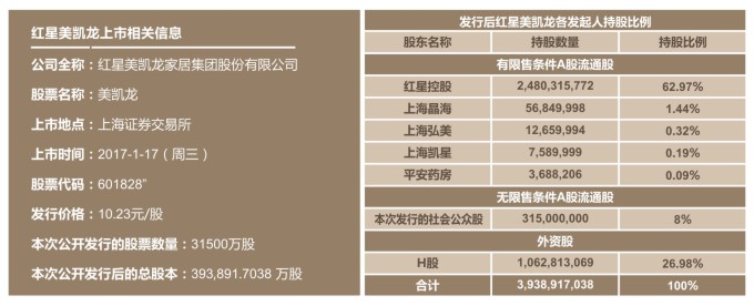 1月17日,红星美凯龙在上海证券交易所敲钟,正式在A股成功上市,股票简称“美凯龙”,股票代码“601828”,成为中国家居零售行业A+H第一股。红星美凯龙本次A股全部为新股发行,发行价格为10.23元/股,股票数量为31,500万股,占总股本的8%,最终募集资金32.22亿元。