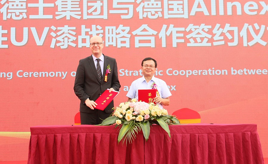 巴德士集团董事长方学平(右)与德国ALLNEX水性UV漆签署战略合作协议
