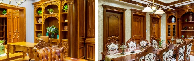 荣其权接着讲述,在材料上,他们用的是北美的白橡、樱桃木,设计风格上根据之前帝露白门的积累的经验,公司开始在整屋全套定制方案的细节上做文章,因为走的是高端市场,所以公司会考虑了很多细节上的方案,比如他们自己研发的原木定制衣柜、原木定制酒柜、原木定制厅柜等系列原木定制柜体和护墙板、吊顶板等,还推出了原木个性化定制产品,再配合原木门、原木楼梯和原木橱柜,成功实现了全屋定制的配套方案。包括款式上,根据之前帝露白门的款式设计所累积的经验,公司先后推出了多种款式,包括欧式、美式、地中海,再到后来甚至是更奢华的中式。